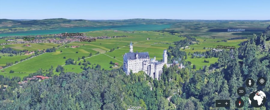 Εδώ βλέπετε το Neuschwanstein (η έμπνευση της Disney για το Sleeping Beauty Castle ), ένα πανέμορφο κάστρο που βρίσκεται στα βουνά των γερμανικών Άλπεων. H 3D απόδοση συλλαμβάνει τη λεπτομερή δομή σε πρώτο πλάνο και τη γραφική πόλη του Schwangau στο βάθος.