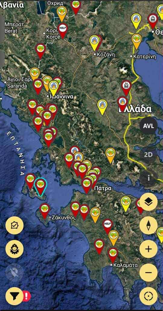 H επιχειρησιακή εικόνα με γεωγραφικό προσδιορισμό των συμβάντων, τα μέσα και το προσωπικό. Με κόκκινο χρώμα είναι οι πυρκαγιές που είναι σε εξέλιξη.