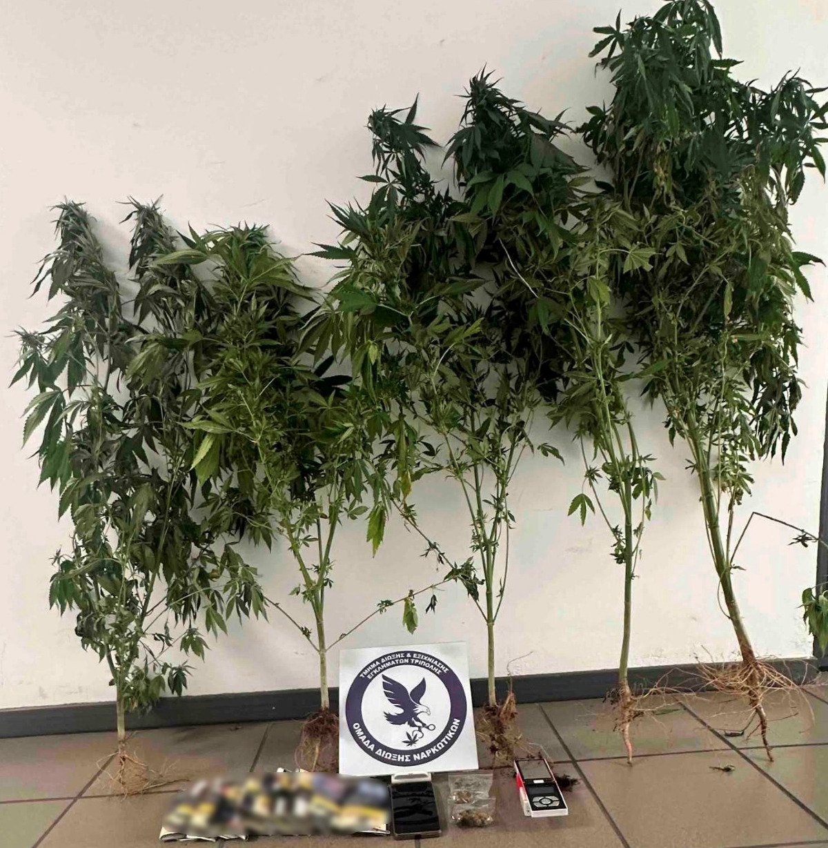 Επίσης βρέθηκε ένα κινητό τηλέφωνο, ως μέσο διευκόλυνσης τέλεσης αξιόποινων πράξεων. Επίσης, σε έρευνα που έγινε στο σπίτι του, βρέθηκαν πέντε δενδρύλλια κάνναβης, ύψους έως 1,60 εκατοστά.