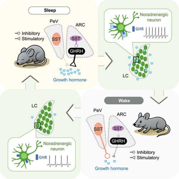 Η απευθείας καταγραφή της νευρικής δραστηριότητας κατά τη διάρκεια πολλών κύκλων ύπνου-αφύπνισης σε ποντίκια, έδειξε ότι η αυξητική ορμόνη απελευθερωνόταν με διαφορετικό τρόπο κατά τη διάρκεια του REM ύπνου (ταχείες κινήσεις των οφθαλμών) και τον μη-REM ύπνο. Παρόλο που η ορμόνη αυξήθηκε και στις δύο φάσεις, η επιρροή των νευρώνων που την προάγουν ή την αναστέλλουν μεταβαλλόταν. Οι ερευνητές εντόπισαν επίσης ένα κύκλωμα ανατροφοδότησης που εμπλέκει νευρώνες στον locus coeruleus (υπομέλας τόπος), ένα τμήμα του εγκεφάλου που σχετίζεται με την αφύπνιση.
