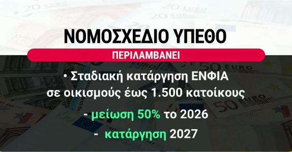 - Σταδιακή κατάργηση ΕΝΦΙΑ σε οικισμούς έως 1.500 κατοίκους: μείωση 50% το 2026 και πλήρης κατάργηση το 2027. Στη Νέα Βύσσα Έβρου το όριο ανεβαίνει στους 1.700 κατοίκους.