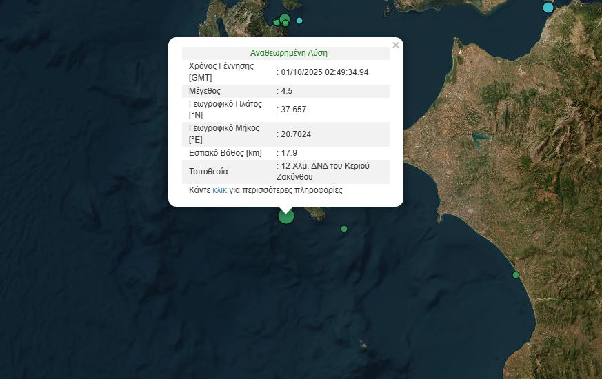 Σεισμική δόνηση μεγέθους 4.5 Ρίχτερ καταγράφηκε στις 05:49 τα ξημερώματα της Τετάρτης, με επίκεντρο 12 χιλιόμετρα δυτικά-νοτιοδυτικά του Κεριού στη Ζάκυνθο και εστιακό βάθος 17,9 χιλιόμετρα.