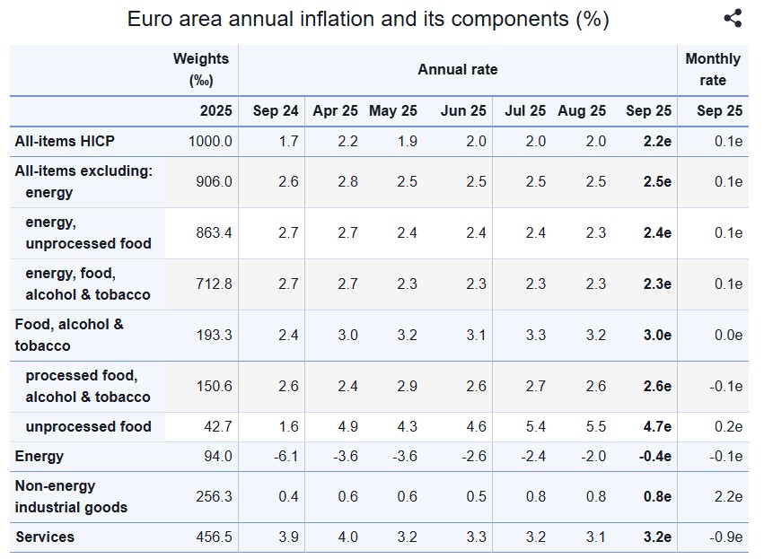 Ο ετήσιος πληθωρισμός στην ευρωζώνη αναμένεται να ανέλθει σε 2,2% τον Σεπτέμβριο του 2025, από 2,0% τον Αύγουστο, σύμφωνα με μια προκαταρκτική εκτίμηση της Eurostat, της στατιστικής υπηρεσίας της Ευρωπαϊκής Ένωσης.