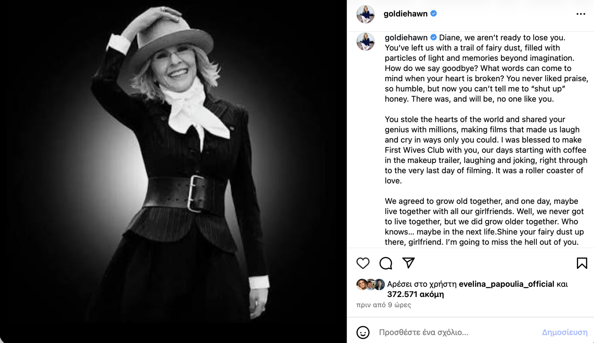 «Νταϊάν, δεν είμαστε έτοιμοι να σε χάσουμε. Άφησες πίσω σου ένα μονοπάτι από νεραϊδόσκονη, γεμάτο φως και αναμνήσεις πέρα από κάθε φαντασία. Πώς να πεις αντίο, όταν η καρδιά σου είναι ραγισμένη; Δεν σου άρεσαν ποτέ οι έπαινοι, γιατί ήσουν τόσο ταπεινή, αλλά τώρα δεν μπορείς να μου πεις “κόψε το, κουκλίτσα μου”. Δεν υπήρξε και δεν θα υπάρξει ποτέ καμία σαν εσένα. Έκλεψες τις καρδιές του κόσμου και μοιράστηκες το ταλέντο σου με εκατομμύρια ανθρώπους, φτιάχνοντας ταινίες που μας έκαναν να γελάμε και να κλαίμε όπως μόνο εσύ ήξερες. Ήμουν ευλογημένη που έκανα μαζί σου το “Κλαμπ Χωρισμένων Γυναικών”, με τα πρωινά μας με καφέ στο τροχόσπιτο του μακιγιάζ, τα αστεία μας, τα γέλια μας, μέχρι και την τελευταία μέρα των γυρισμάτων. Ήταν ένα ταξίδι στις ράγες της αγάπης. Είχαμε συμφωνήσει να γεράσουμε μαζί και ίσως, μια μέρα, να ζήσουμε μαζί με όλες τις φίλες μας. Δεν προλάβαμε να “μοιραστούμε” το μαζί στο “τώρα”, αλλά μεγαλώσαμε μαζί. Ποιος ξέρει… ίσως στην επόμενη ζωή τα καταφέρουμε. Ράντιζε με τη χρυσοσκόνη σου εκεί πάνω, φίλη μου. Θα μου λείψεις απίστευτα. Η καρδιά μου είναι με τα υπέροχα παιδιά σου, τον Ντεξ και τον Ντιουκ. Σ’ αγαπώ.»