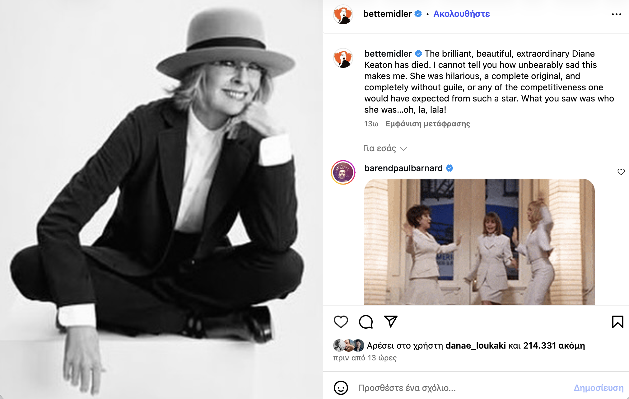 Τα κορίτσια του «Κλαμπ Χωρισμένων Γυναικών» (First Wives Club), η Γκόλντι Χον και η Μπέτι Μίντλερ, αποχαιρετούν με συγκίνηση τη Νταϊάν Κίτον, την αξεπέραστη συμπρωταγωνίστριά τους στη θρυλική κωμωδία του 1996, που ύμνησε τη γυναικεία φιλία, τη δύναμη και το δικαίωμα στη δεύτερη ευκαιρία (και, στην πραγματικότητα, σηματοδότησε την υπόλοιπη καριέρα της Νταϊάν Κίτον, η οποία τα τελευταία χρόνια εστίασε σε ρομαντικές κωμωδίες με ηρωίδες γυναίκες άνω των 60).