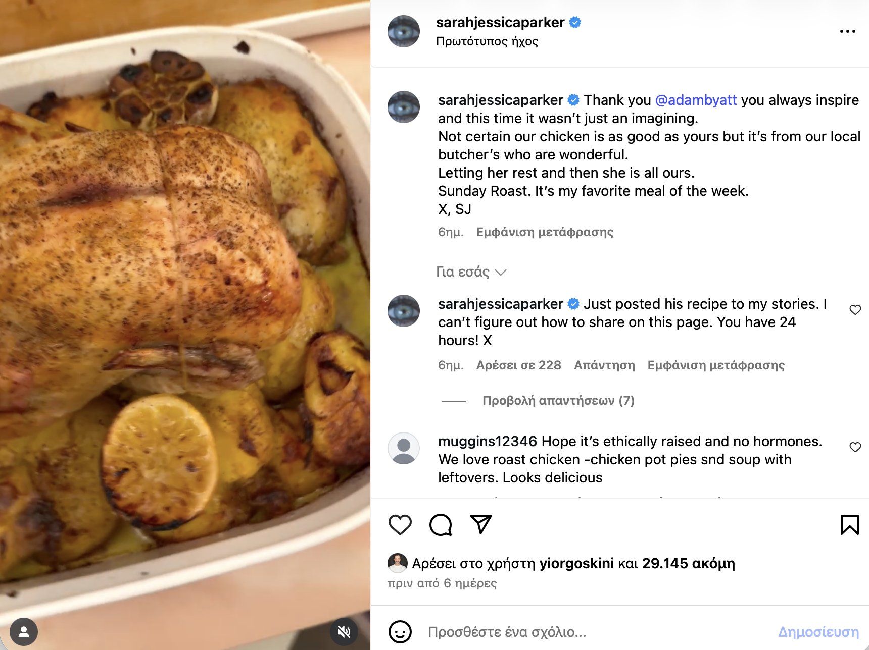 Με ένα άγγιγμα χιούμορ —που σίγουρα θα ενέκρινε και η ίδια η Νταϊάν— δεν μπορεί να περάσει απαρατήρητο ότι η τελευταία ανάρτηση της Σάρα Τζέσικα Πάρκερ, λίγες μέρες πριν τον θάνατο της Κίτον, ήταν… ένα ψητό κοτόπουλο. Μια λεπτομέρεια που μοιάζει αστεία και σουρεαλιστική, αλλά τόσο συμβατή με το νευρωτικό και ιδιοσυγκρασιακό στυλ της Κίτον. Νομίζω και η ίδια θα γελούσε, σε μια αποδελτιοποίηση όσων βρέθηκαν αναρτημένα για την απώλειά της, από τις φίλες και συνεργάτισσές της σε αυτή τη μοναδική εμβληματική ταινία που μεταμόρφωσε ένα μέτριο βιβλίο σε ταινία δεύτερης ευκαιρίας και γυναικείας χειραφέτησης.