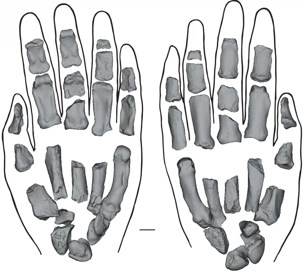 Τα οστά του χεριού δείχνουν έναν μακρύ αντίχειρα, ίσια δάχτυλα και ένα ευκίνητο μικρό δάχτυλο, στοιχεία που υποδηλώνουν ότι μπορούσε να σχηματίζει ισχυρή λαβή, παρόμοια με αυτή που χρησιμοποιεί ο άνθρωπος όταν κρατά ένα εργαλείο. Παράλληλα, η πλατιά μορφή των δαχτύλων θυμίζει έντονα εκείνη των γοριλών, κάτι που εξέπληξε τους επιστήμονες.