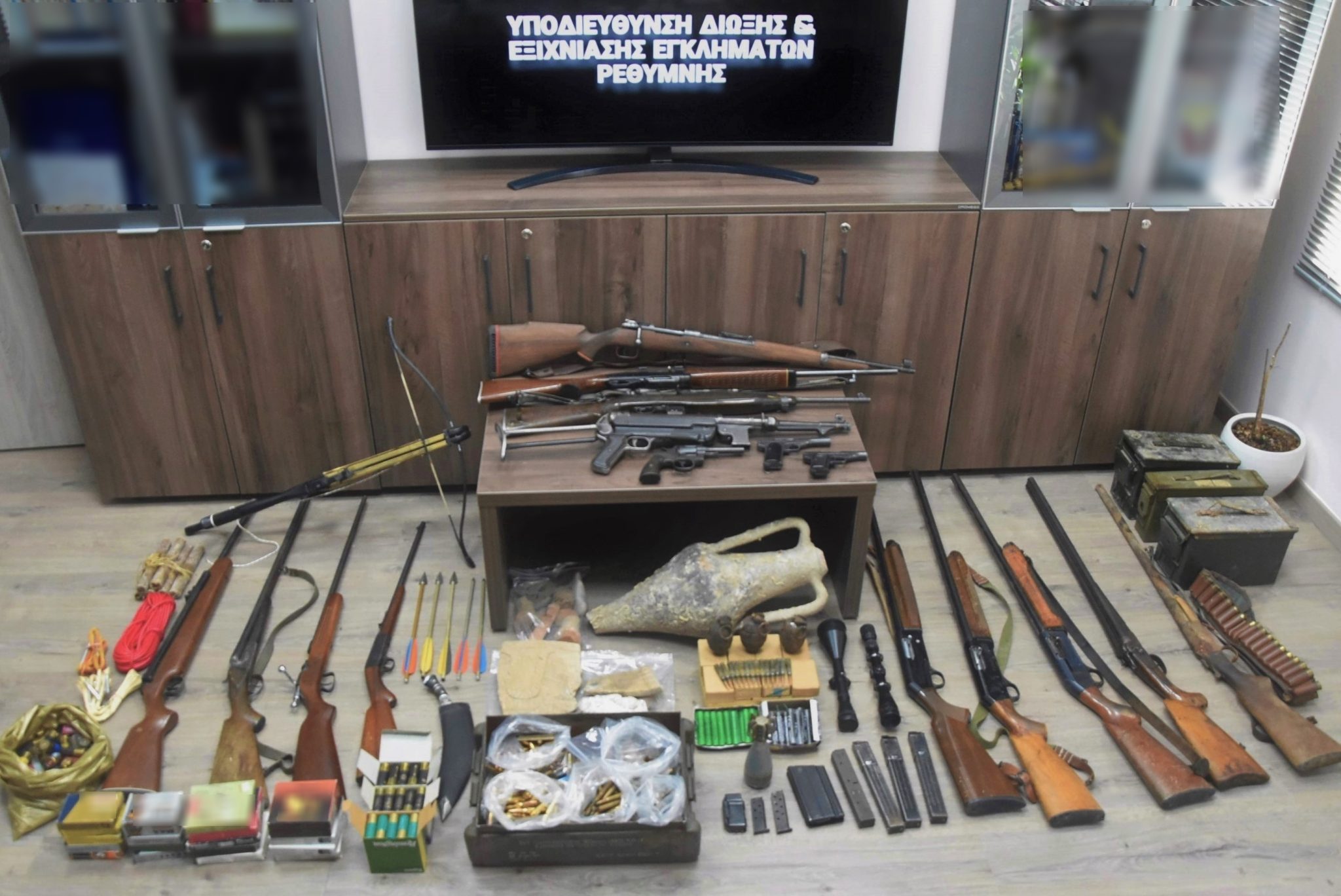 Ένα μικρό οπλοστάσιο με τουλάχιστον 16 όπλα διάφορων τύπων, διαμετρημάτων καθώς και πλήθος παράνομων πολεμικών υλικών, έκρυβε ένας 77χρονος στο σπίτι και σε χώρους ιδιοκτησίας του σε περιοχή του Δήμου Αγίου Βασιλείου στο Ρέθυμνο.