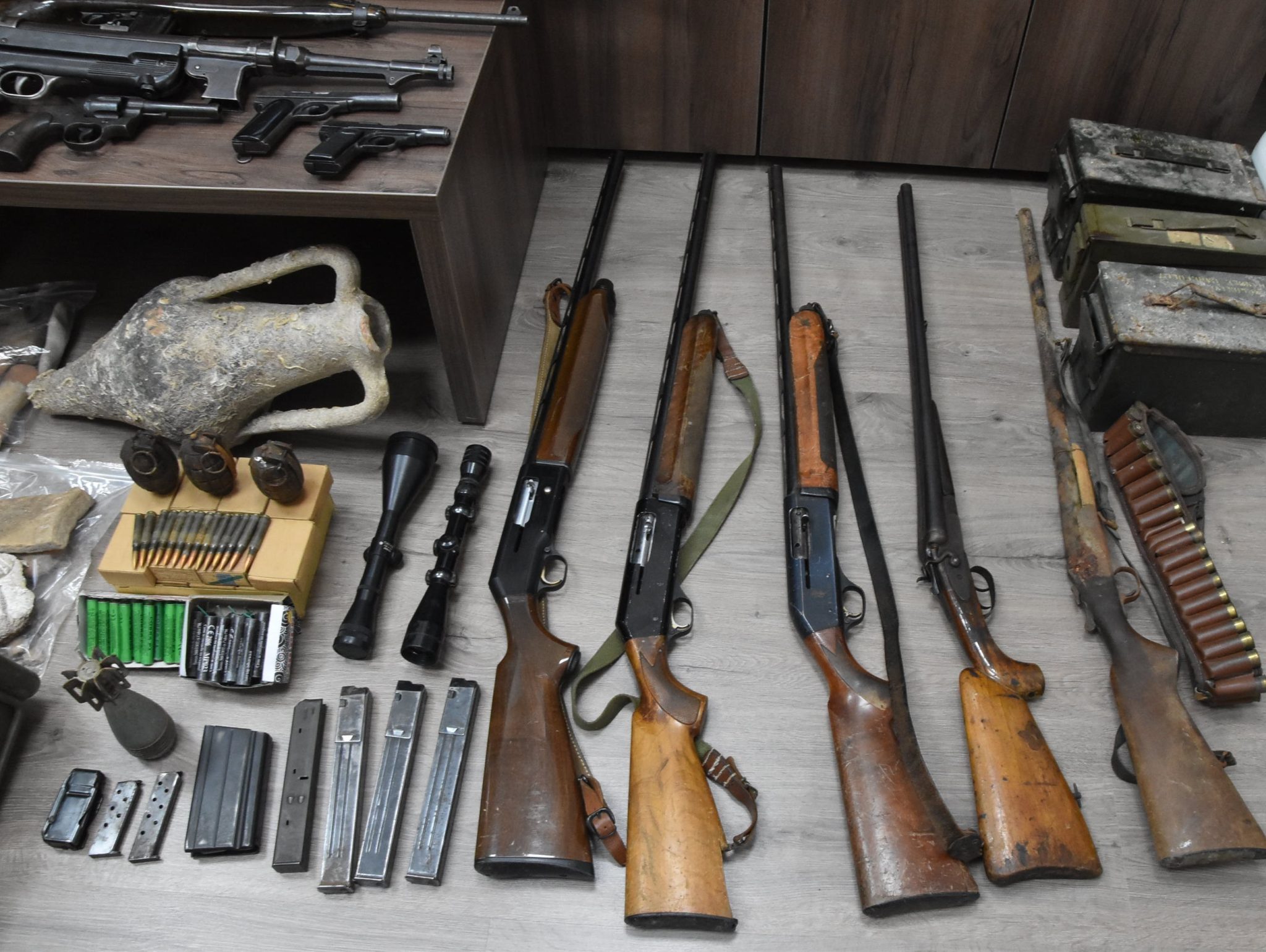 Μάλιστα, σύμφωνα με την ανακοίνωση της Αστυνομίας, στην κατοχή του συλληφθέντα βρέθηκαν μεταξύ άλλων χιλιάδες φυσίγγια, εκατοντάδες γραμμάρια δυναμίτη, πυροκροτητές, κροτίδες, καθώς και ένας πήλινος αμφορέας, μαζί με πλήθος πήλινων και λίθινων θραυσμάτων, αγνώστου χρονικής περιόδου.