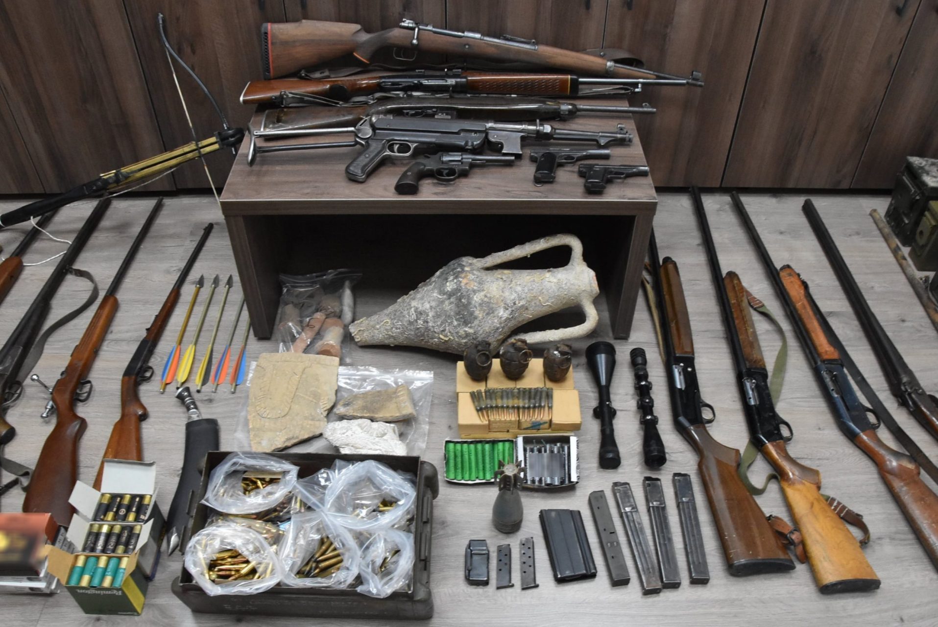 Μάλιστα, σύμφωνα με την ανακοίνωση της Αστυνομίας, στην κατοχή του συλληφθέντα βρέθηκαν μεταξύ άλλων χιλιάδες φυσίγγια, εκατοντάδες γραμμάρια δυναμίτη, πυροκροτητές, κροτίδες, καθώς και ένας πήλινος αμφορέας, μαζί με πλήθος πήλινων και λίθινων θραυσμάτων, αγνώστου χρονικής περιόδου.
