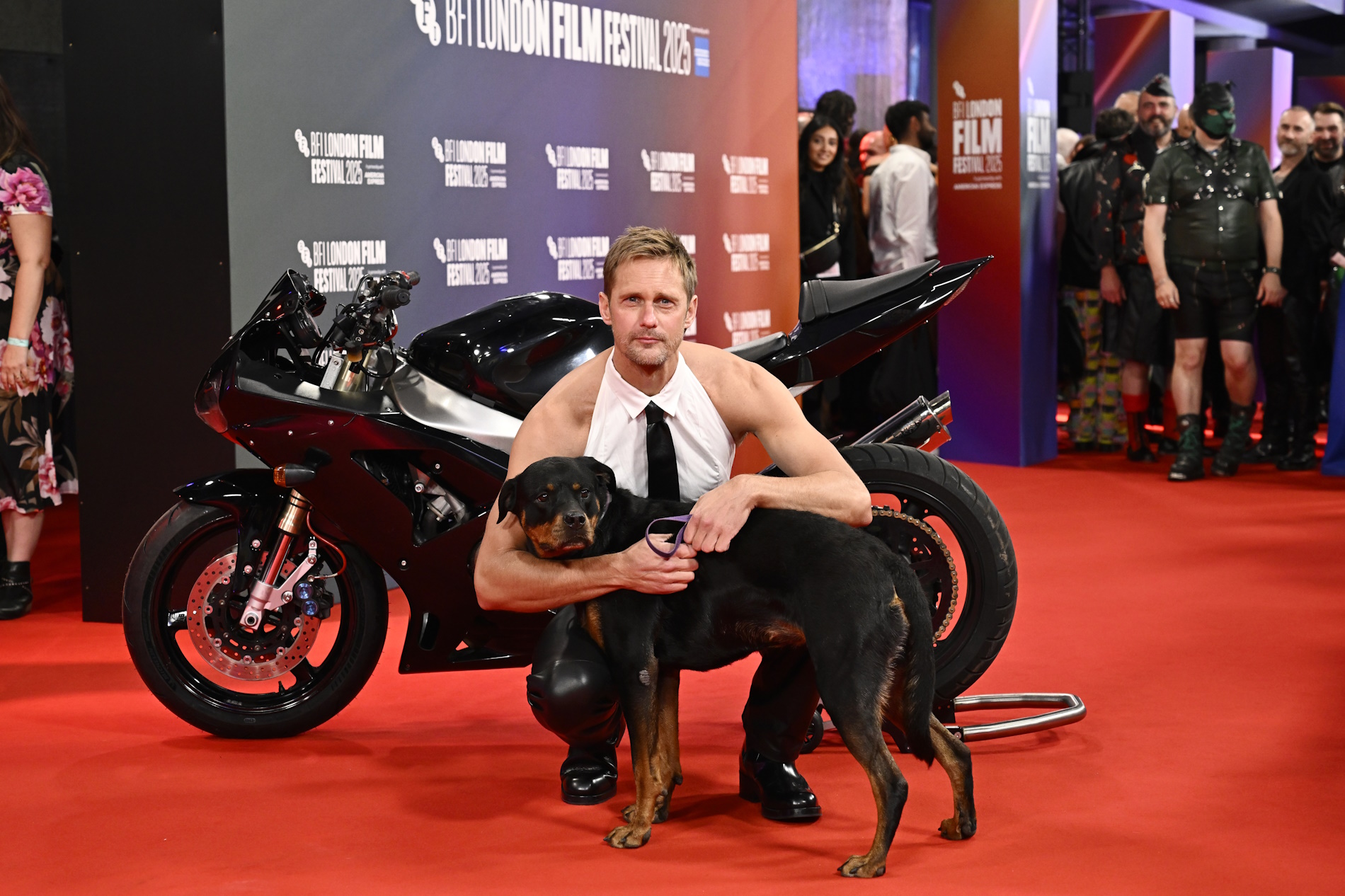 Στο κόκκινο χαλί του BFI London Film Festival, πόζαρε μαζί με τους συμπρωταγωνιστές του — ανάμεσά τους ο Paul Talies και το σκυλί του στην οθόνη, Maggie — μπροστά από μια τεράστια μηχανή.