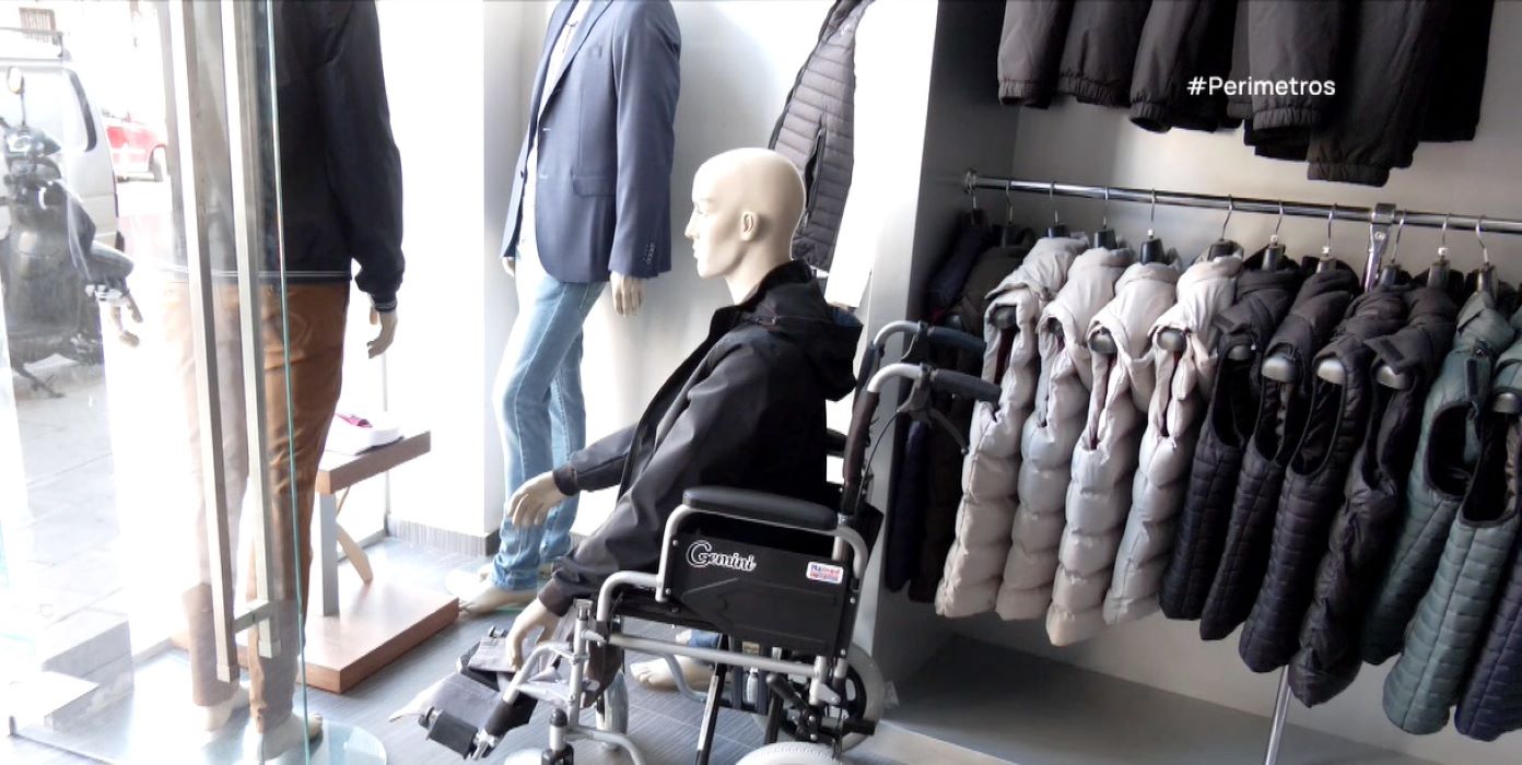 Εκεί που πέφτουν τα φώτα της προβολής μιας βιτρίνας δίπλα σε σε ρούχα, παπούτσια και είδη της καθημερινότητας, οι περαστικοί βλέπουν και αναπηρικά αμαξίδια. Μια κούκλα υπενθυμίζει ότι τα άτομα που βρίσκονται στα αμαξίδια έχουν το δικαίωμα να πηγαίνουν στην αγορά και να μπορούν να εισέλθουν στα καταστήματα.
