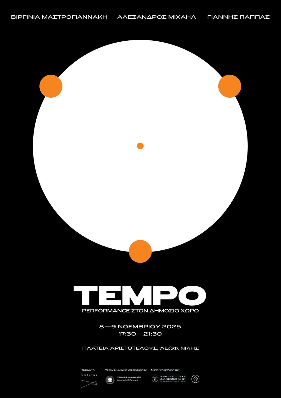 Μετά τις long duration performances «24 ώρες στην πόλη | Σαν σκιά» (2023) και «Flow» (2024), o vatiras συμπράττει με τρεις διεθνώς καταξιωμένους Έλληνες καλλιτέχνες, προσκαλώντας το κοινό της Θεσσαλονίκης σε ένα πείραμα ισορροπίας, ελέγχου και ανατροπής. Το TEMPO, σε σύλληψη και επιτέλεση Βιργινίας Μαστρογιαννάκη, Αλέξανδρου Μιχαήλ και Γιάννη Παππά, είναι η νέα παραγωγή του vatiras, που παρουσιάζεται στις 8 και 9 Νοεμβρίου στην Πλατεία Αριστοτέλους στη Θεσσαλονίκη, επιδιώκοντας να εξερευνήσει την ενσώματη αγωνία της διαχείρισης μιας κατάστασης συλλογικής ευθύνης.