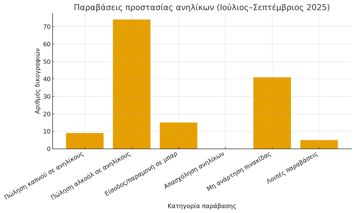 • Η πιο συχνή παράβαση αφορά την πώληση ή διάθεση αλκοόλ σε ανηλίκους, με 74 δικογραφίες και 82 συλλήψεις — σχεδόν το ήμισυ του συνόλου των παραβάσεων.