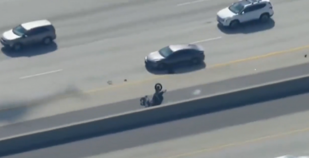 Με σκηνές που θύμισαν κινήσεις από χολιγουντιανή ταινία, ολοκληρώθηκε μια καταδίωξη στον αυτοκινητόδρομο του Λος Άντζελες, όταν αυτοκίνητο, οδηγούμενο από αστυνομικό εκτός υπηρεσίας, συγκρούστηκε με μοτοσικλέτα υψηλής ταχύτητας, προκαλώντας την πτώση του αναβάτη.