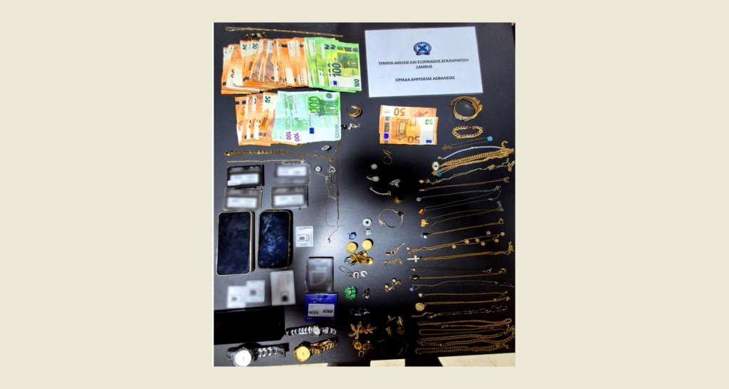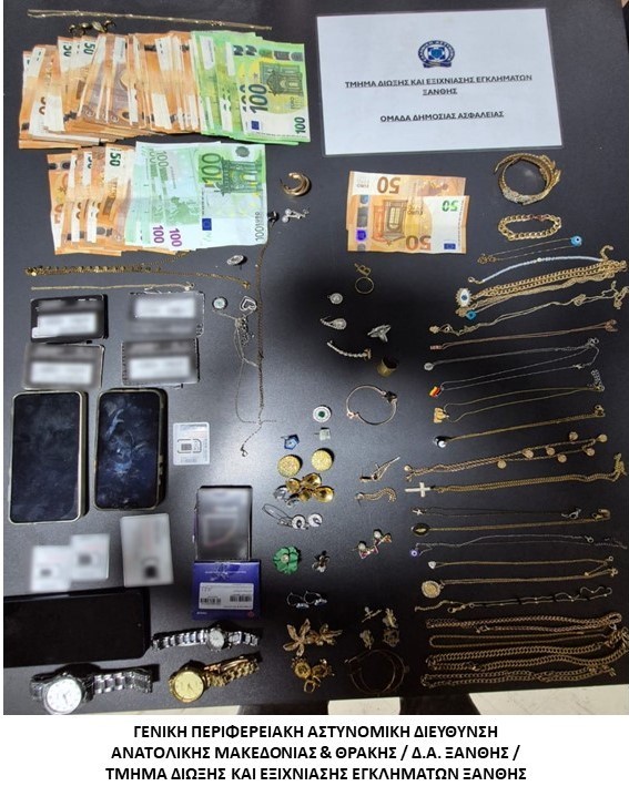 Επιπλέον, από την οικία και την κατοχή των συλληφθέντων, κατασχέθηκαν συνολικά μεταξύ άλλων: το χρηματικό ποσό των 10.550 ευρώ, χρυσαφικά-τιμαλφή μέρος των οποίων αποδόθηκε στους παθόντες, και κινητά τηλέφωνα.