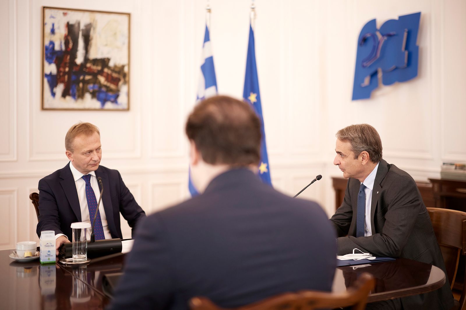 Ο Πρωθυπουργός Κυριάκος Μητσοτάκης συναντήθηκε το πρωί με τον Ευρωπαίο Επίτροπο για τον Προϋπολογισμό, την Καταπολέμηση της Απάτης και τη Δημόσια Διοίκηση Piotr Serafin, στο Μέγαρο Μαξίμου.