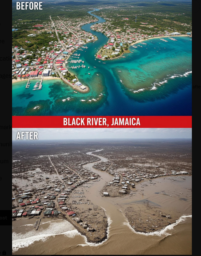 Η εικόνα πριν και μετά από τον τυφώνα στην περιοχή Black River της Τζαμάικα, αποτυπώνει το μέγεθος της καταστροφής στο νοτιοδυτικό τμήμα του νησιού που δέχτηκε κύματα άνω των 4,5 μέτρων. Η πόλη χρονολογείται από τον 17ο αιώνα και είχε εξελιχθεί σε κέντρο περιβαλλοντικού τουρισμού.