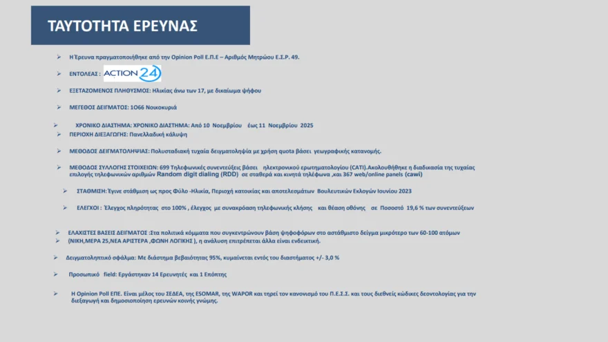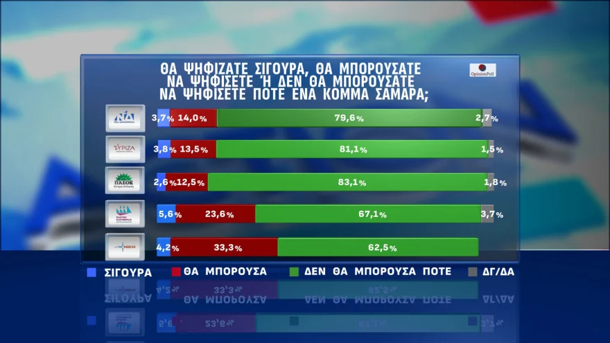Προβάδισμα 16,5 μονάδων στην εκτίμηση ψήφου καταγράφει η ΝΔ σύμφωνα με τη νέα δημοσκόπηση της Opinion Poll για λογαριασμό του Action 24.