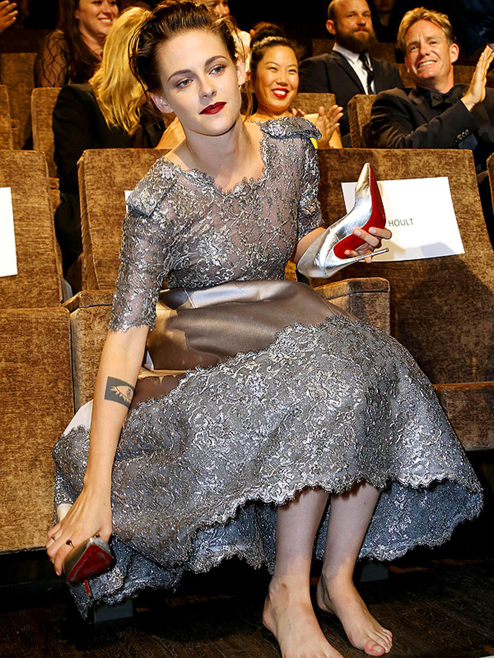 Η σταρ εμφανίστηκε στο κόκκινο χαλί κατά την πρεμιέρα της ταινίας Equals με ένα εκπληκτικό φόρεμα χορού που άρχιζε και τελείωνε με μία ασημένια δαντέλα, αλλά αυτή αισθάνθηκε καλύτερα όταν κάθισε στη θέση της κι έβγαλε από τα πόδια, τις ασημί ψηλοτάκουνες γόβες που φορούσε.