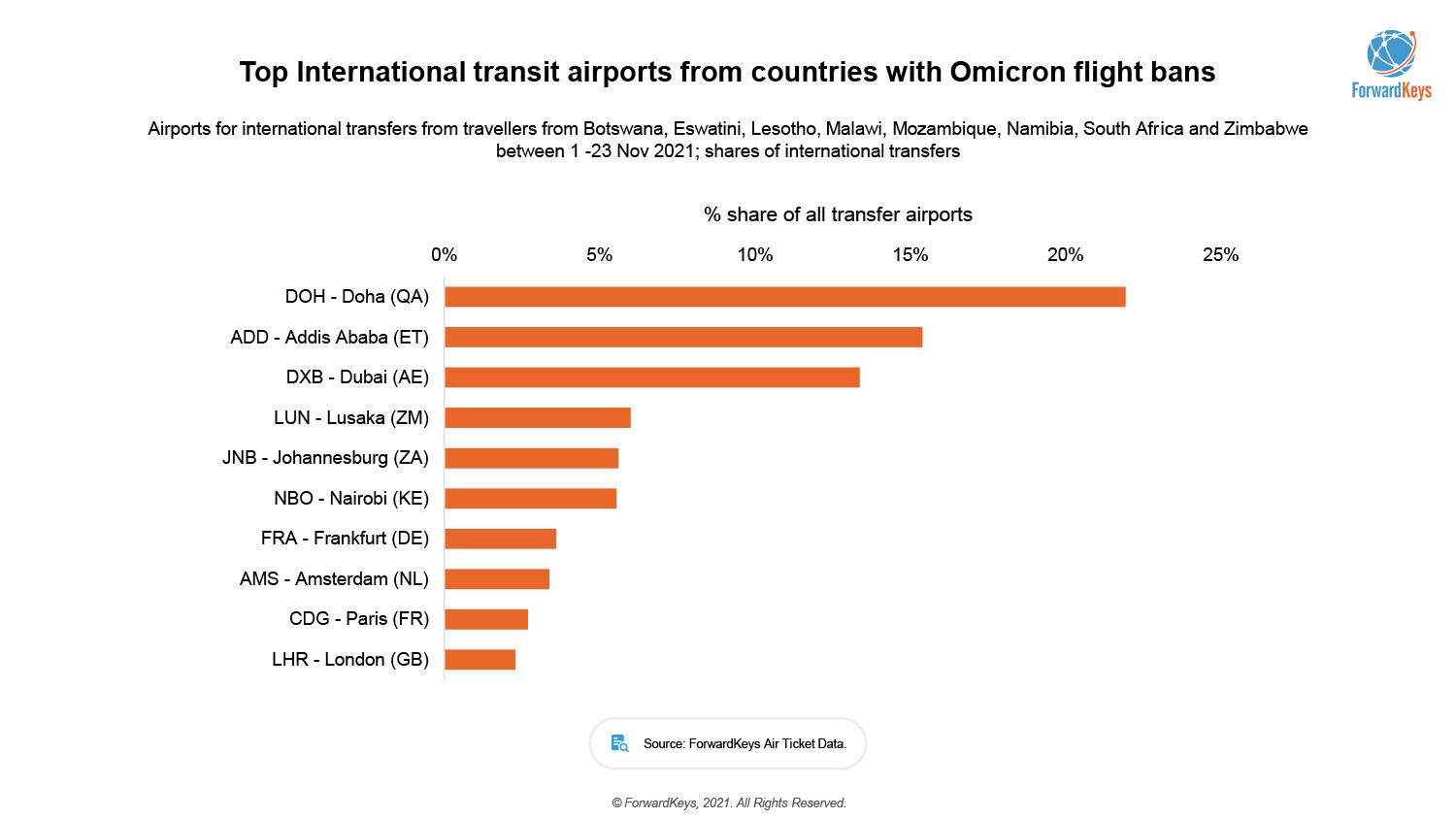 Όσον αφορά τα αεροδρόμια που χρησιμοποίησαν ως τελικό προορισμό ή σαν transit, επιβάτες για μεταβίβαση προς άλλα αεροδρόμια στην κορυφή βρίσκεται το αεροδρόμιο της Ντόχα στο Κατάρ με 22% , η Αντίς Αμπέμπα με 15% το Ντουμπάι με 13 % , η Λουσάκα με 6%, Γιοχάνεσμπουργκ και Ναϊρόμπι με 6% , Φρανκφούρτη με 4 %, Άμστερνταμ και Παρίσι με 3% και Λονδίνο με 2%. Αυτά τα στοιχεία τονίζει ο αντιπρόεδρος της ForwardKeys ίσως βοηθήσουν τις κυβερνήσεις να αντιμετωπίσουν πιο εστιασμένα την νέα αυτή παράλλαξη, χωρίς να χρειαστεί να καταφύγουν σε ολοκληρωτικά μέτρα όπως ολική απαγόρευση των πτήσεων που καταστρέφουν συνολικά αεροπορικές εταιρείες και οικονομία.