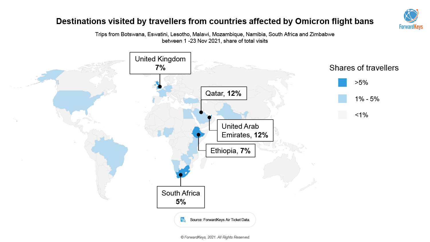 Πολύ ενδιαφέροντα στοιχεία μας δίνει η έρευνα της ForwardKeys που δημοσιεύθηκαν σήμερα σχετικά με τις αεροπορικές μετακινήσεις από την Νότια Αφρική και άλλες 8 χώρες της περιοχής όπου ανιχνεύθηκαν τα πρώτα κρούσματα της μετάλλαξης Όμικρον, αλλά και τα αεροδρόμια που χρησιμοποίησαν σαν transit ταξιδιώτες αλλά και ως τελικό προορισμό.