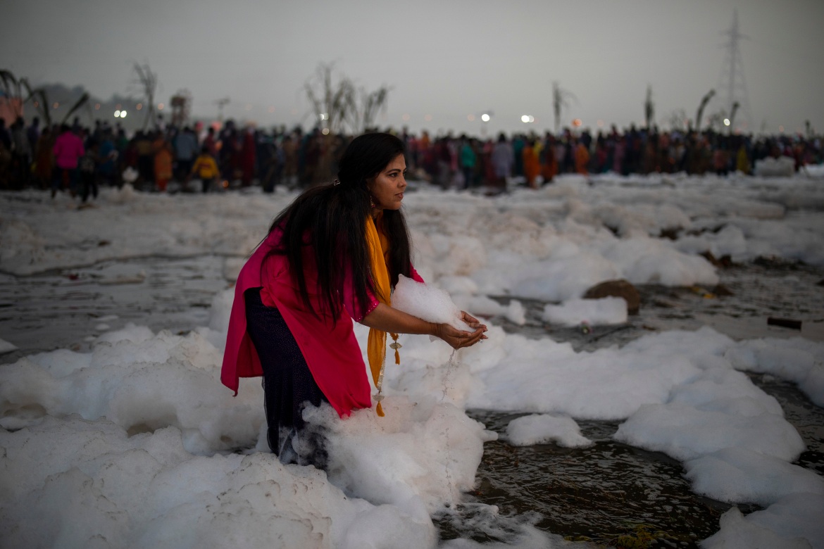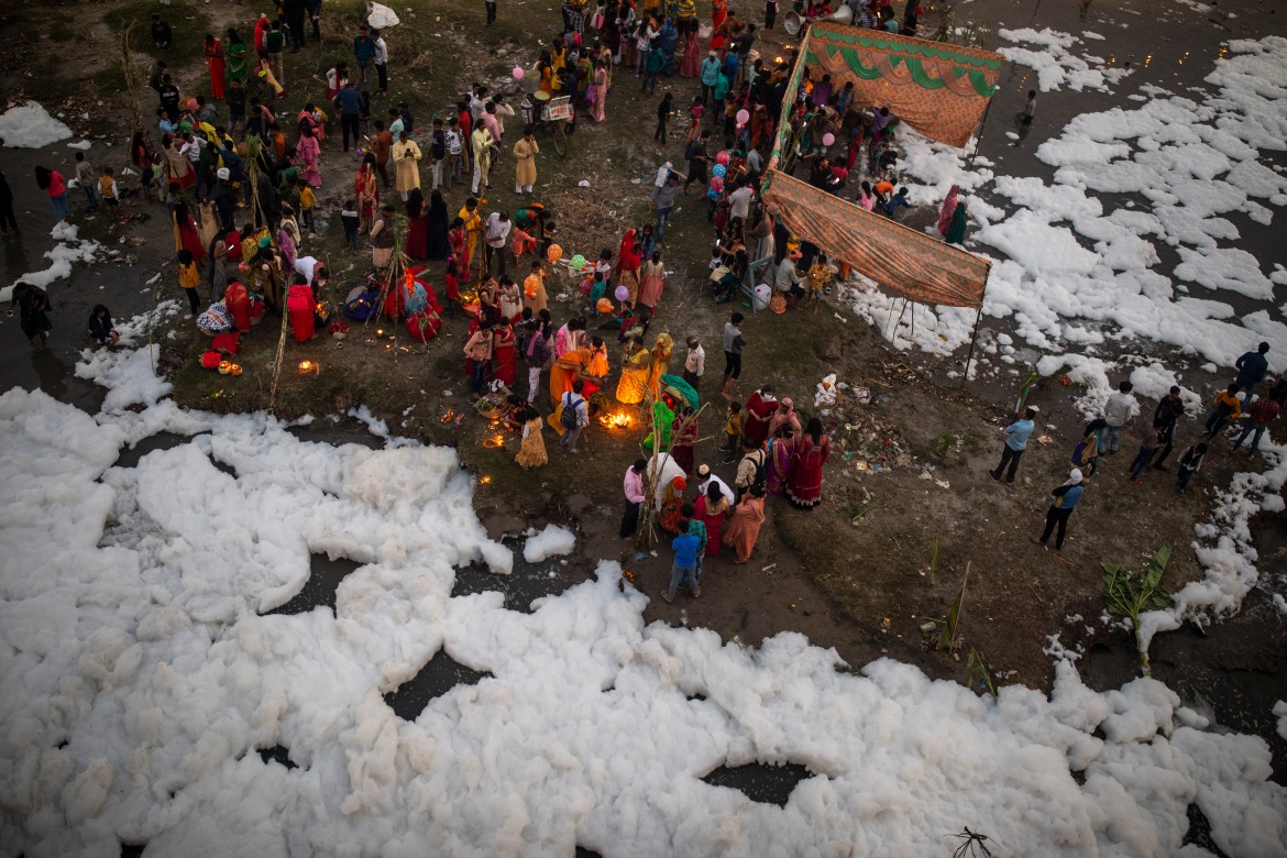Σε έναν από τους πιο ιερούς ποταμούς των Ινδών, στον Γιαμούνα οι πιστοί κολυμπούν μέσα σε μολυσμένο τοξικό αφρό