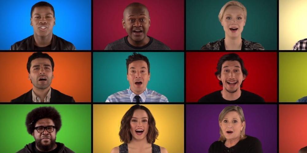 Όλο το cast του Star Wars: The Force Awakens μαζί με τον JImmy Fallon και το συγκρότημα Roots τραγουδάει a cappella τη μουσική στο Τonight Show.
