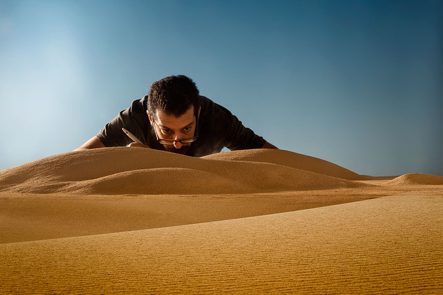 Χρειάστηκε φακούς, χαρτί άμμου, σκόνη, νερό και αφρό προκειμένου να στήσει το άρτιο σκηνικό που απαιτεί η φωτογράφιση. Και είναι τόσο αληθοφανής ξεγελώντας τον θεατή που βλέπει τις φωτογραφίες.