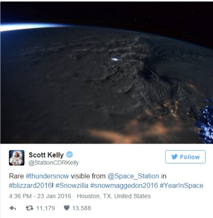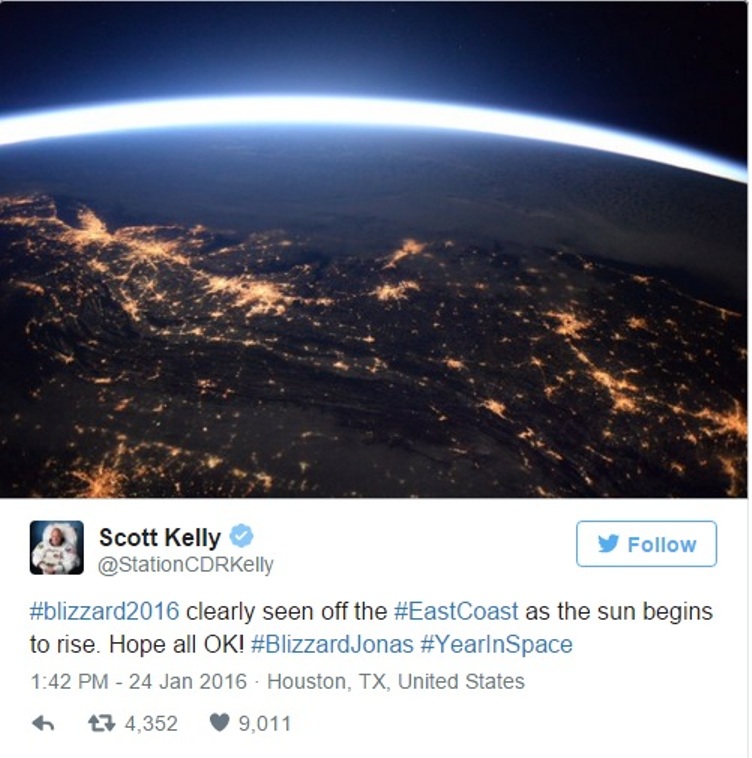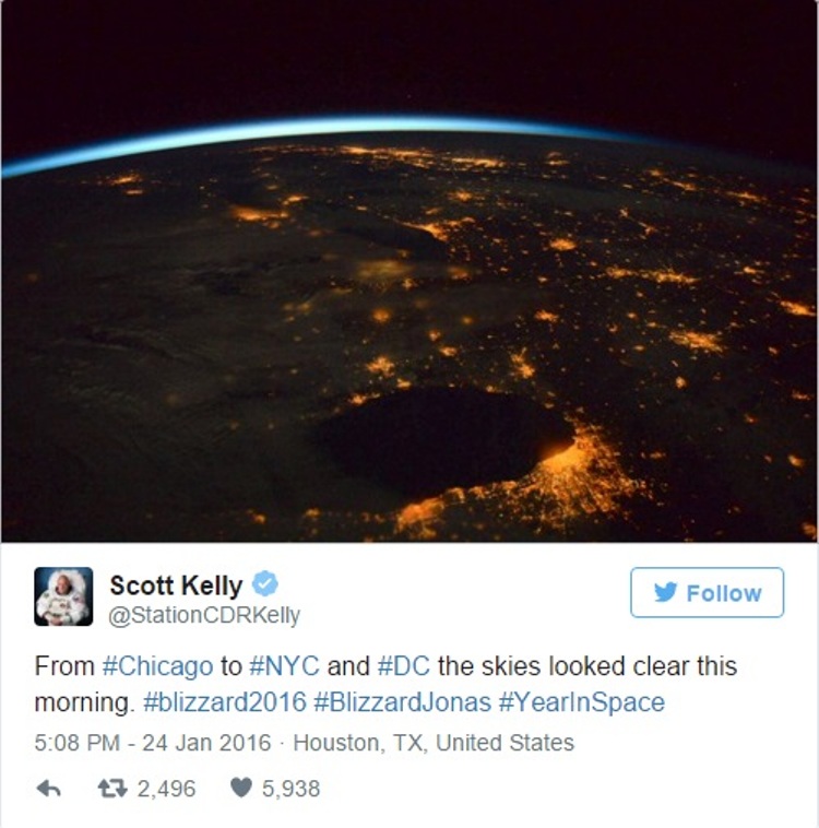 Ο Scott Kelly από τον Διεθνή Διαστημικό Σταθμο τράβηξε φωτογραφίες των Ηνωμένων Πολιτειών από το διάστημα κατά τη διάρκεια της χιονοκαταιγίδας Jonas που έχει παραλύσει τη χώρα.