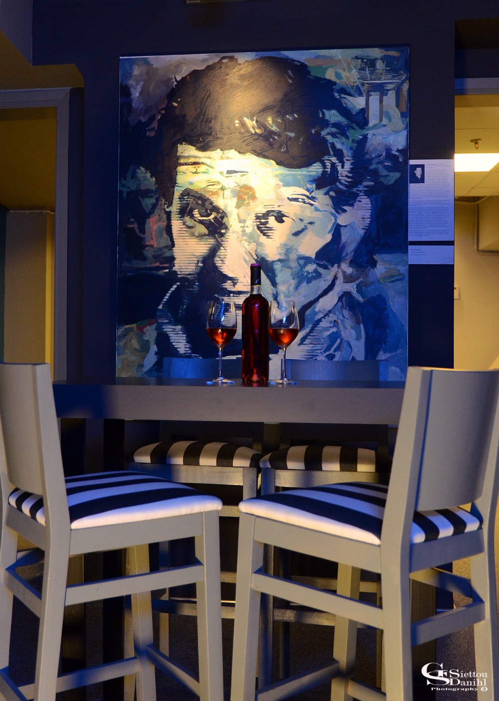 Στο jazz ύφος παραπέμπουν τα μουσικά όργανα εποχής, όπως οι τρομπέτες και το σαξόφωνο στην είσοδο του φουαγιέ. Ο χώρος αναμονής και τα σκαμπό πλαισιώνονται από υφάσματα με ασπρόμαυρη ρίγα.