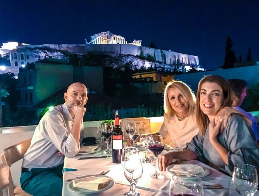 Με φόντο το θέατρο στο Takis Foundation