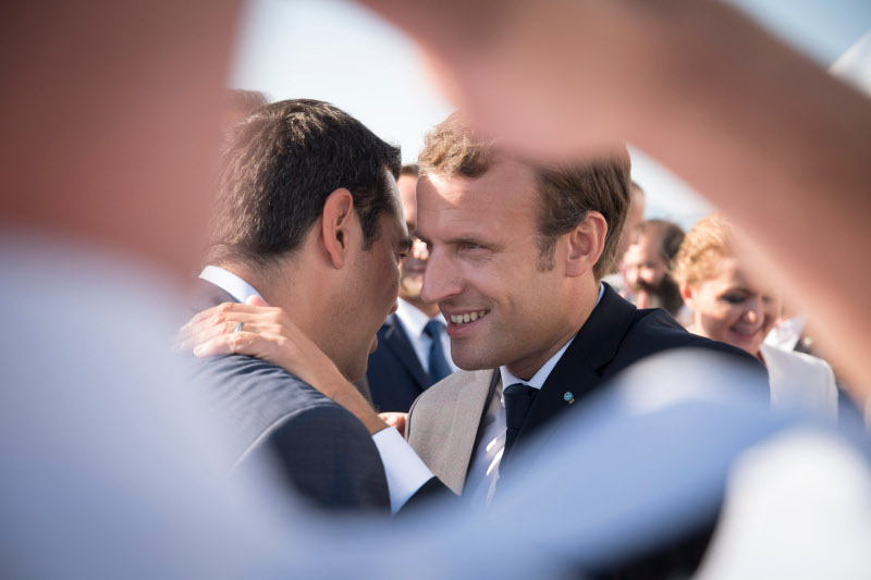 Λίγο μετά τις 17.30, το απόγευμα της Παρασκευής (8/9) ο πρωθυπουργός Αλέξης Τσίπρας, αποχαιρέτισε με θερμό εναγκαλασμό στο αεροδρόμιο, τον Emmanuel και την Brigitte Macron. Τους συνόδευσε έως τη σκάλα του προεδρικού αεροσκάφους.
