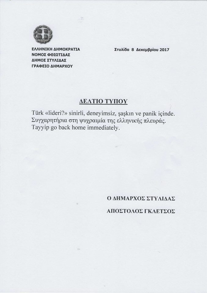 «Tayyip go back home immediately» («Ταγίπ γύρνα στη χώρα σου αμέσως»), είναι το μήνυμα που στέλνει ο δήμαρχος Στυλίδας Απόστολος Γκλέτσος στον τούρκο πρόεδρο Ρετζέπ Ταγίπ Ερντογάν, με αφορμήν την επίσκεψή του στην Ελλάδα. Από τον Γιώργο Βράτσο
