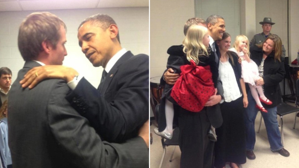 Δυο ημέρες αργότερα, ο Αμερικανός Πρόεδρος πήγε μέχρι Newtown. Επισκέφτηκε το Sandy Hook. Περπάτησε στους διαδρόμους του σχολείου, μίλησε με τους δασκάλους και τα παιδιά που είχαν επιβιώσει του μακελειού αλλά και τους χαροκαμένους γονείς που είχαν χάσει τα παιδιά τους.