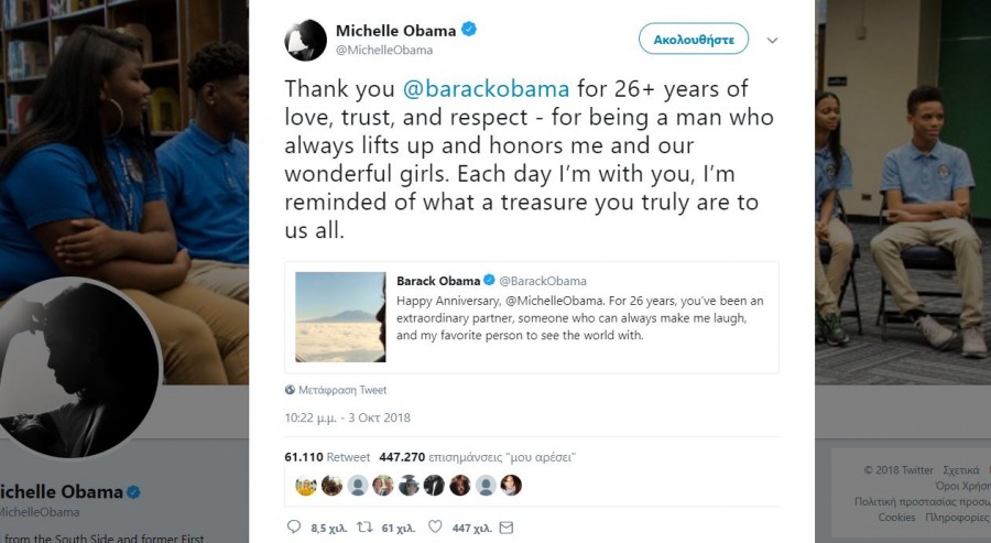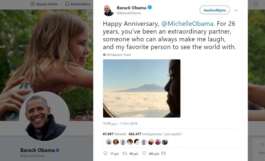 Ο πρώην πρόεδρος των ΗΠΑ, Μπαράκ Ομπάμα, ευχήθηκε με αυτά τα τρυφερά λόγια στη σύζυγο του, Μισέλ για την 26η επέτειο τους, και έλαβε την εξής απάντηση: «Κάθε μέρα που είμαι μαζί σου, μου θυμίζει ότι είσαι ένας πραγματικός θησαυρός για όλους μας».