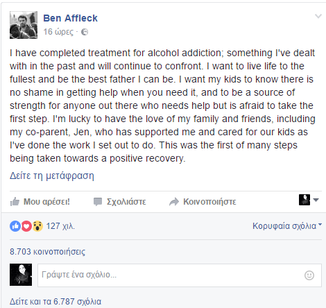 Γνωστός ηθοποιός του Hollywood «πολεμά» το αλκοόλ και μιλά ανοιχτά για τη μάχη κατά του αλκοολισμού αλλά και τη στήριξη από την οικογένειά του. Πιο συγκεκριμένα, ο Ben Affleck μέσω μιας ανάρτησης στο Facebook «ανοίγεται» για τα προβλήματα που αντιμετωπίζει με το αλκοόλ αλλά και τα βήματα που έχει κάνει για να τα αντιμετωπίσει.