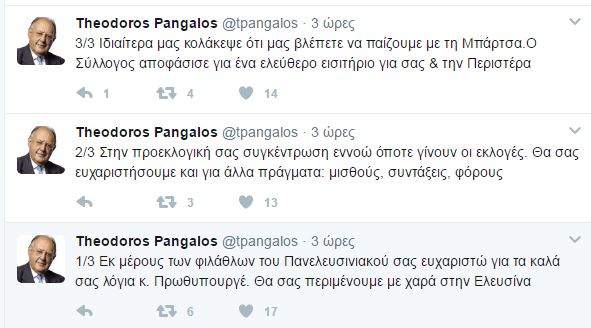 «Εκ μέρους των φιλάθλων του Πανελευσινιακού σας ευχαριστώ για τα καλά σας λόγια κ. Πρωθυπουργέ. Θα σας περιμένουμε με χαρά στην Ελευσίνα. Την προεκλογική σας συγκέντρωση εννοώ όποτε γίνουν οι εκλογές. Θα σας ευχαριστήσουμε και για άλλα πράγματα: μισθούς, συντάξεις, φόρους. Ιδιαίτερα μας κολάκεψε ότι μας βλέπετε να παίζουμε με τη Μπάρτσα. Ο Σύλλογος αποφάσισε για ένα ελεύθερο εισιτήριο για σας και την Περιστέρα» έγραψε ο κ. Πάγκαλος.