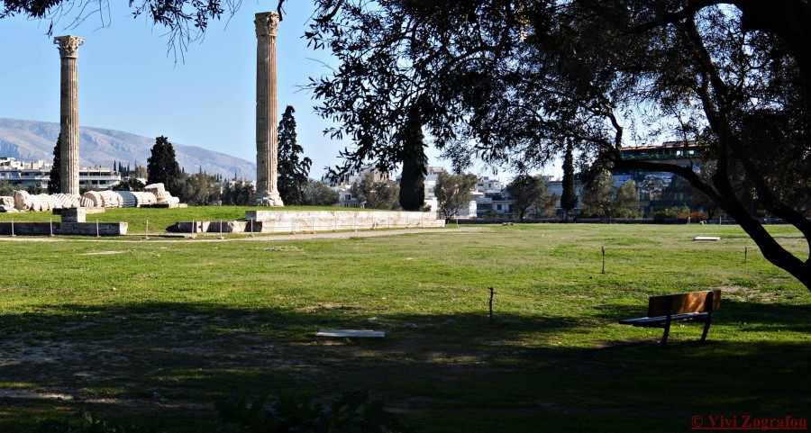 Ιδού το μεγαλείο! Κάτσε στο παγκάκι απέναντι από τους στύλους. Ανάμεσα στις σελίδες του βιβλίου σου απόλαυσε το υπέροχο θέαμα: Γιγάντιες κολώνες με 17 μέτρα ύψος 2,6μέτρα διάμετρο και 364 τόνους βάρος, Κορινθιακού ρυθμού, φτιαγμένες από πεντελικό μάρμαρο. Δεσπόζουν στον χώρο όρθιες εδώ και πάνω από 18 αιώνες. Παρατήρησε και τις άλλες κολώνες, που είναι κομμένες, δίπλα στις όρθιες, σε τεράστιες φέτες Το χορτάρι που έχει ο χώρος τις αναδεικνύει εξαιρετικά. Αν δεν διαβάσεις εδώ φιλοσοφία, το «Περί ύψους» πού θα το κάνεις;
