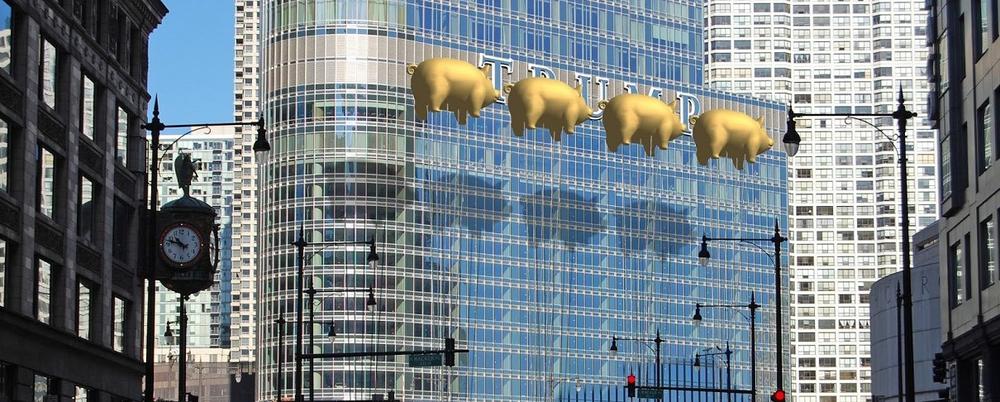 Το αποτέλεσμα ήρθε γρήγορα από το αρχιτεκτονικό γραφείο New World Design Ltd και την πιο ροκ πρόταση, που τέθηκε ποτέ στο τραπέζι των συζητήσεων. Σύμφωνα με το αρχιτεκτονικό γραφείο, η τεράστια επιγραφή με το όνομα του Trump στην πρόσοψη του πύργου θα μπορούσε να κρυφτεί με έναν άκρως καλλιτεχνικό και σημειολογικό τρόπο. Πως; Μα φυσικά με τέσσερα ιπτάμενα γουρούνια, μπαλόνια τα οποία θα πετούν στον ουρανό του Σικάγο.