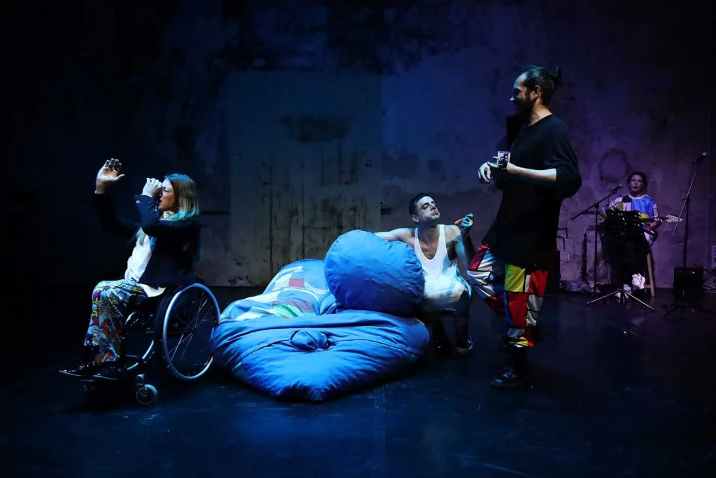 Ο «Αόριστος», σε διασκευή και σκηνοθεσία της Λουκία Ανάγνου, είναι ένα μιούζικαλ δωματίου. Μια μικρή ζωντανή ορχήστρα, μια σκηνή που σχεδόν την ακουμπάς, ένα μιούζικαλ τσέπης που το βλέπεις χαλαρά στα τρία μέτρα μπροστά σου. Η Ανάγνου αγαπά τις διασκευές. Πιστεύει ότι το βίωμα είναι συλλογικό, και ως προς τη ψυχοθεραπεία, αλλά και ως προς τον τρόπο που το σύστημα αντιμετωπίζει τους ψυχικά νοσούντες: «Θίγονται κάποια ζητήματα και το χιούμορ είναι καταγγελτικό», λέει. Και όντως είναι. Γελάς και λίγο ντρέπεσαι που γελάς.