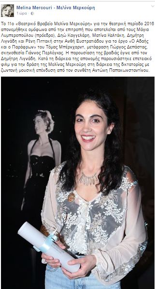 «Το 11ο «Θεατρικό Βραβείο Μελίνα Μερκούρη» για την θεατρική περίοδο 2016 απονεμήθηκε ομόφωνα από την επιτροπή που αποτελείται από τους Μάγια Λυμπεροπούλου (πρόεδρο), Δηώ Καγγελάρη, Ματίνα Καλτάκη, Δημήτρη Λιγνάδη και Ρένη Πιττακή στην Ανθή Ευστρατιάδου για το έργο «Ο Αδαής και ο Παράφρων» του Τόμας Μπέρνχαρντ, μετάφραση Γιώργος Δεπάστας, σκηνοθεσία Γιάννος Περλέγκας. Η παρουσίαση της βραδιάς έγινε από τον Δημήτρη Λιγνάδη. Κατά τη διάρκεια της απονομής παρουσιάστηκε επετειακό φιλμ για την δράση της Μελίνας Μερκούρη στη διάρκεια της δικτατορίας με ζωντανή μουσική επένδυση από τον συνθέτη Αντώνη Παπακωνσταντίνου».