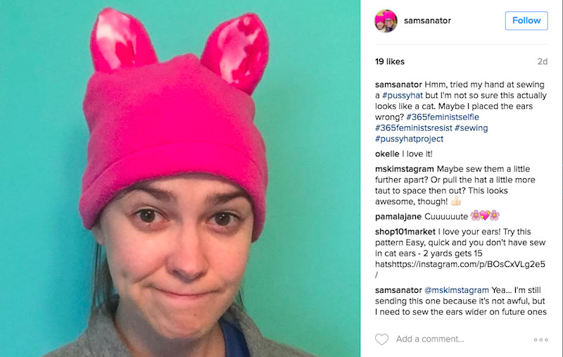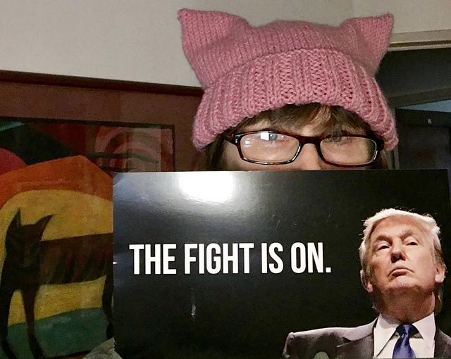 Το ροζ σκουφάκι με αυτιά γάτας είναι σήμα κατατεθέν των γυναικών κατά του Donald Trump κάνοντας ένα λογοπαίγνιο με την αγγλική γλώσσα και τη φράση «pussy hats». «Pussy» πέρα από γατάκι, χρησιμοποιείται και με τη μεταφορική έννοια και σημαίνει αιδοίο.
