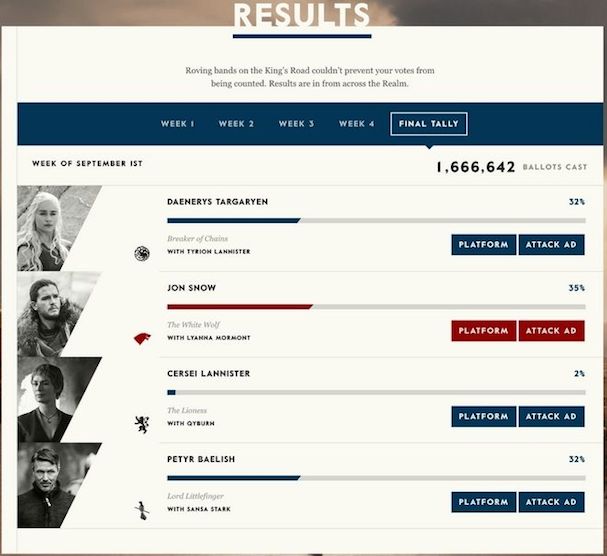Η δημοφιλής τηλεοπτική σειρά και το HBO διεξήγαγαν επί ένα μήνα προεκλογική καμπάνια, καλώντας τους fans να ψηφίσουν ποιος ή ποια θέλουν να καθίσει στον «Iron Throne».