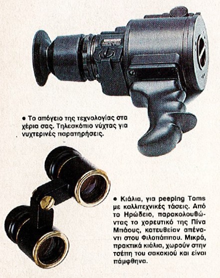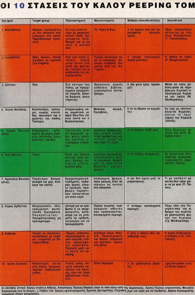 Καταγράφοντας τους πιθανούς χώρους που θα χάριζαν οφθαλμολογικές ηδονές, θα έπρεπε να σταθούμε σε κάτι πολύ απλό και ανώδυνο. Την καθημερινή πραγματικότητα, τον κοινωνικό, χωροταξικό μας περίγυρο. Είναι αλήθεια ότι στις μέρες μας ένας peeping-Tom έχει πολλές ευκαιρίες. Χιλιάδες εικόνες περνούν με ιλιγγιώδεις ρυθμούς εμπρός από τα μάτια του. Από τις πλέον απλές, έως τις πλέον προχωρημένες. Αρκεί με θάρρος και παρρησία να ζει ο Tom τον κόσμο του. Να ξέρει να βρίσκεται την κατάλληλη στιγμή στο σωστό μέρος.