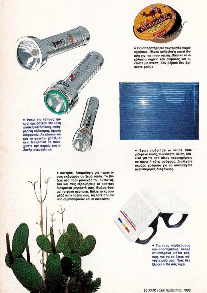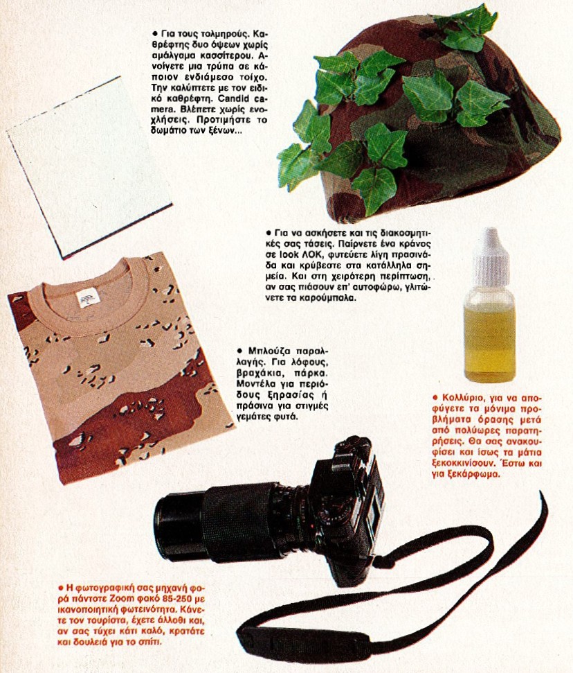 Εδώ πρέπει να παρατηρείς χωρίς οι άλλοι να εντοπίζουν αυτό που βλέπεις όταν γουρλώνεις τα μάτια. Θέλει προσοχή, ένα ιδιαίτερο λουκ και προετοιμασία. Αδιάφορο, ντεκοντρακτέ ύφος, μάτι ψύχραιμο και όχι στάιλ Μάρτυ Φέλντμαν, δεξιοτεχνία στο βάδισμα ανάμεσα σε χιλιάδες κορμιά που ανέμελα κολυμπούν και μαυρίζουν. Αποφεύγεις οπωσδήποτε κιάλια, τηλεσκόπια και άλλα οπτικά εξαρτήματα που σε κάνουν να ξεχωρίζεις. Σωστή επιλογή στην αμφίεση. Μπανιερό σε στυλ φαρδύ μπόξερ ή βερμούδα με σαφέστατα ειδική εσωτερική, κατά προτίμηση «πετσετέ», επένδυση. Εξασφαλίζετε το διακριτικό, έντονο συνήθως ερεθισμό και αποφεύγετε τους δύσκολους λεκέδες στις κρίσιμες στιγμές. Μην ξεχάσετε βέβαια τα γυαλιά ηλίου. Κρύβουν βλέμματα και είναι σίγουρο ότι κανείς δεν θα διακρίνει τα κατακόκκινα (λίγο πριν το στάδιο της επιπεφυκίτιδας) μάτια σας. Για πιο προχωρημένες δραστηριότητες, μην ξεχνάτε… Ψάξτε για καβούρια, πεταλίδες, αχινούς, παίξτε με τα παιδάκια της φίλης που βρίσκετε τυχαία, χτίστε στην άμμο παλάτια. Τέλος πάντων, δημιουργήστε κάποιο αληθοφανές άλλοθι. Μην ξεχνάτε ότι η θέση που επιλέγετε βοηθάει. Προτιμήστε σημεία που ο ήλιος θα είναι πίσω από εσάς και κόντρα στους άλλους. (Πρώτον, εσείς θα βλέπετε καλύτερα, δεύτερον, οι άλλοι δεν θα μπορούν εύκολα να σας διακρίνουν). Υπάρχουν ορισμένες θέσεις περισσότερο συγκεκριμένες που, ενώ μειώνουν την ελευθερία των κινήσεων προσφέρουν αληθινούς θησαυρούς. Αραγμένα σκάφη (τα φινιστρίνια κάνουν πάντοτε εκπληκτικό καδράρισμα), καμπίνες (με «τρύπες εξαερισμού»), βράχια, δένδρα, αρμυρίκια, λοφίσκοι, τοιχαλάκια κρύβουν και επιτρέπουν στους μάνιακ να χρησιμοποιήσουν και τον τεχνολογικό τους εξοπλισμό.