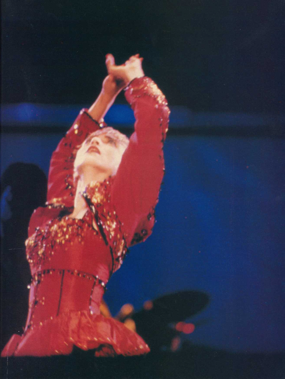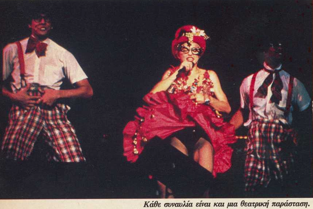 Οι λάιβ εμφανίσεις της Μαντόνα είναι καλοδουλεμένα και εντυπωσιακά σόου. Το σκηνικό των πρόσφατων συναυλίων π.χ. είναι εμπνευσμένο από το βίντεο κλιπ του Μοντινό. Ένα τζάμπο 747 Cargo ένα DC-7, 23 καμιόνια και 50 άτομα μεταφέρουν και στήνουν τη σκηνή και τα ντεκόρ, αριθμοί εντυπωσιακοί και για το γύρισμα ταινίας. Πάνω στη σκηνή η Μαντόνα τα κάνει όλα. Τραγουδάει, χορεύει, μιμείται και, κύρια, κάνει μεταφορικά έρωτα μ’ ό,τι βρει μπροστά της, ακόμη και με τον αέρα. Βέβαια, από κοντά γίνεται εμφανές ότι δυσκολεύεται, αφού φυσάει και ξεφυσάει σαν λαχανιασμένο τρένο στην ανηφόρα. Βέβαια ποιος έχει την ψυχραιμία να τα δει όλα αυτά στη διάρκεια των. κονσέρτων…