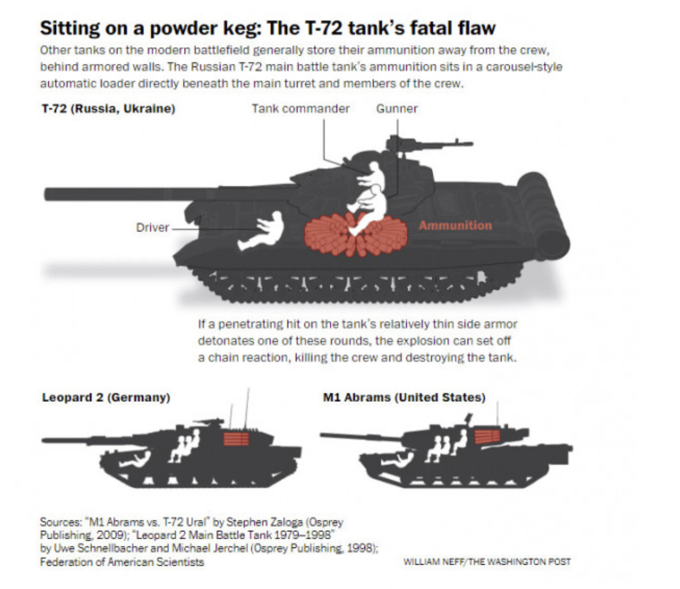 Οι Ρώσοι μάλιστα χρησιμοποιούν ως επι το πλείστων παλαιάς σχεδίασης άρματα Τ-72 γνωρίζοντας την συγκεκριμένη αδυναμία σχεδιασμού εν αντιθέσει με πιο σύγχρονα που δεν έχουν εμφανιστεί ακόμα στο πεδίο της μάχης.
