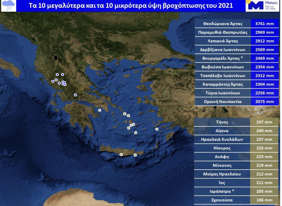 Ως προς τις βροχοπτώσεις, η Ήπειρος ανέκτησε τα πρωτεία μετά από 3 χρόνια, με το μετεωρολογικό σταθμό στα Θεοδώριανα Άρτας να καταγράφει ετήσιο ύψος βροχόπτωσης 3761 χιλιοστά, τιμή που αποτελεί ρεκόρ ετήσιας βροχόπτωσης για όλους τους σταθμούς του δικτύου του Εθνικού Αστεροσκοπείου Αθηνών / meteo.gr στα 15 χρόνια λειτουργίας του. Αντίθετα, τα μικρότερα ετήσια ύψη βροχόπτωσης εντοπίζονται στις Κυκλάδες, στη Νότια Κρήτη και στα Δωδεκάνησα.