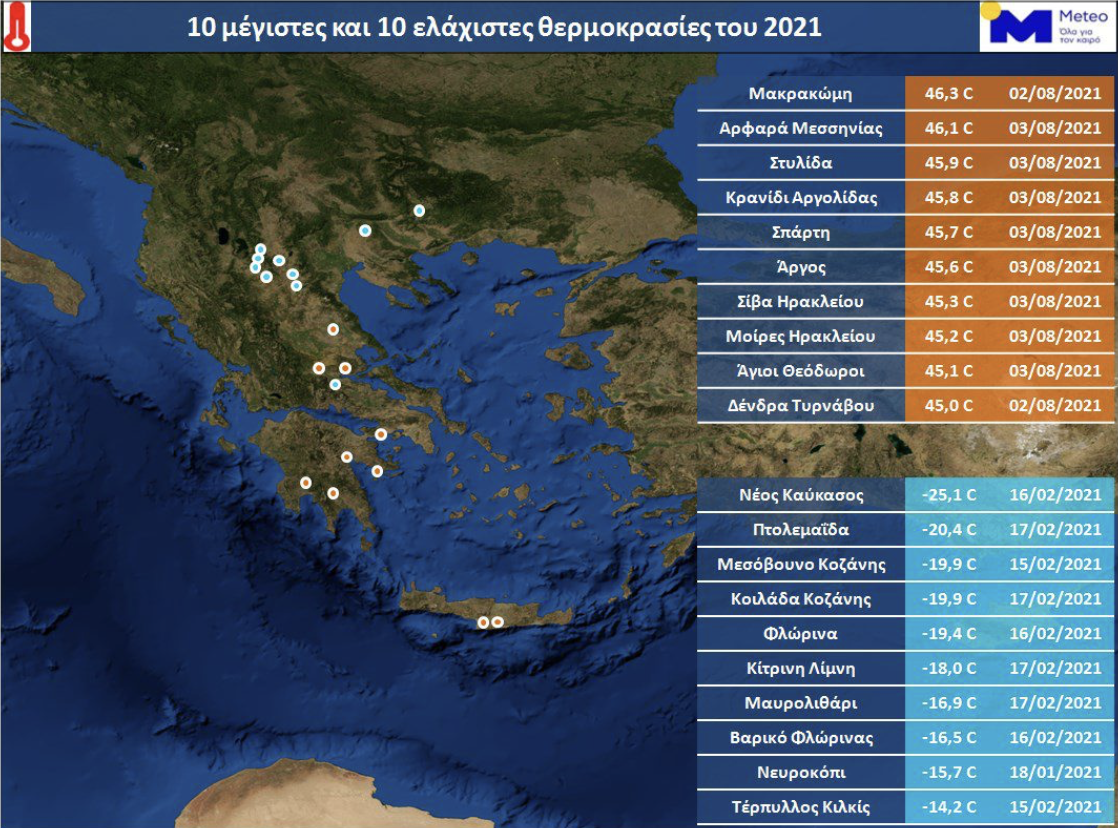 Στο χάρτη που ακολουθεί παρουσιάζονται 10 μέγιστες και 10 ελάχιστες θερμοκρασίες σε επιλεγμένους μετεωρολογικούς σταθμούς (πλην χιονοδρομικών κέντρων και δολινών) για το 2021.